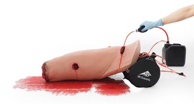 Un système manuel de pompe à sang fournit du sang artificiel à chaque plaie individuellement, à deux d'entre elles ou à trois plaies en même temps. Divers scénarios d'hémorragie pulsatile veineuse ou artérielle peuvent être simulés facilement et de manière réaliste. L'étudiant obtient un retour d'information direct (arrêt du saignement par occlusion mécanique) lorsque l'application de la technique de contrôle des hémorragies choisie est réussie.