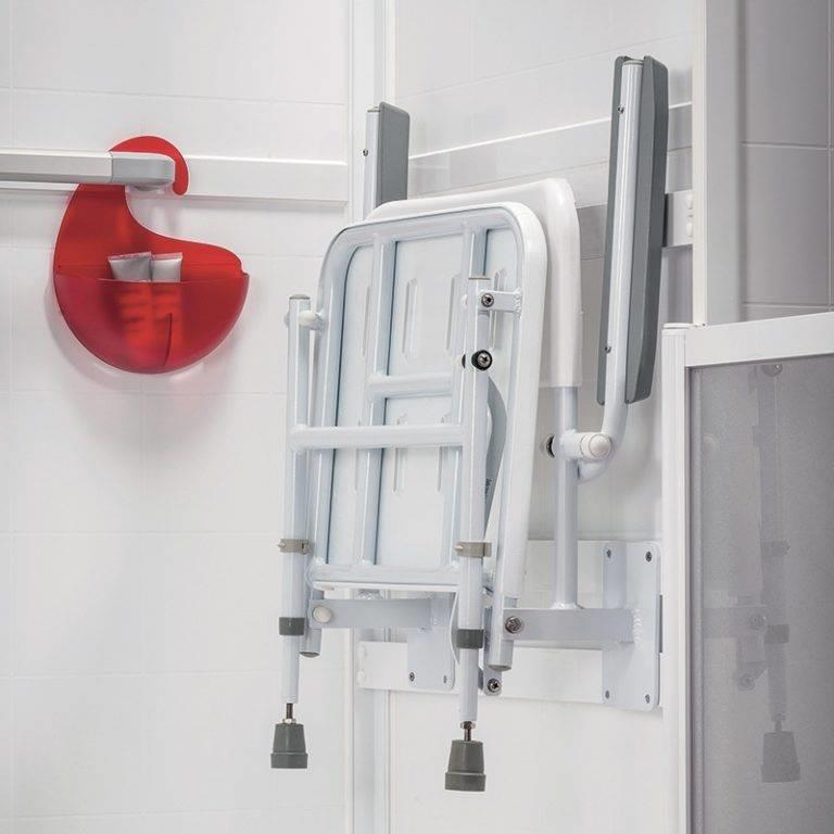 L’assise et le dossier sont rembourrés et peuvent s’enlever. Pourvu également de 2 accoudoirs rembourrés et rabattables pour un transfert plus facile et La fixation murale se fait par 2 x 4 vis (non incluses).