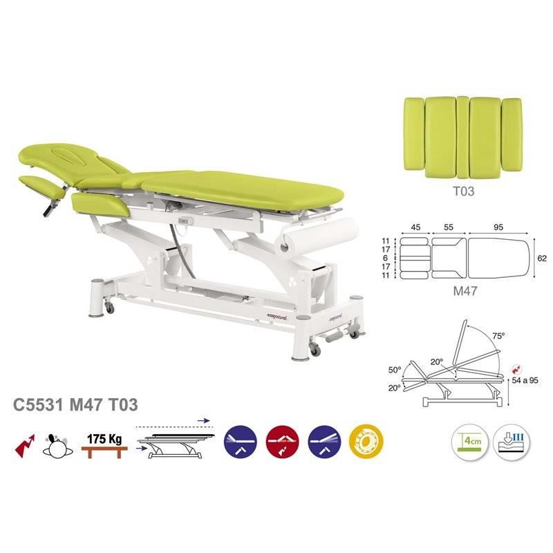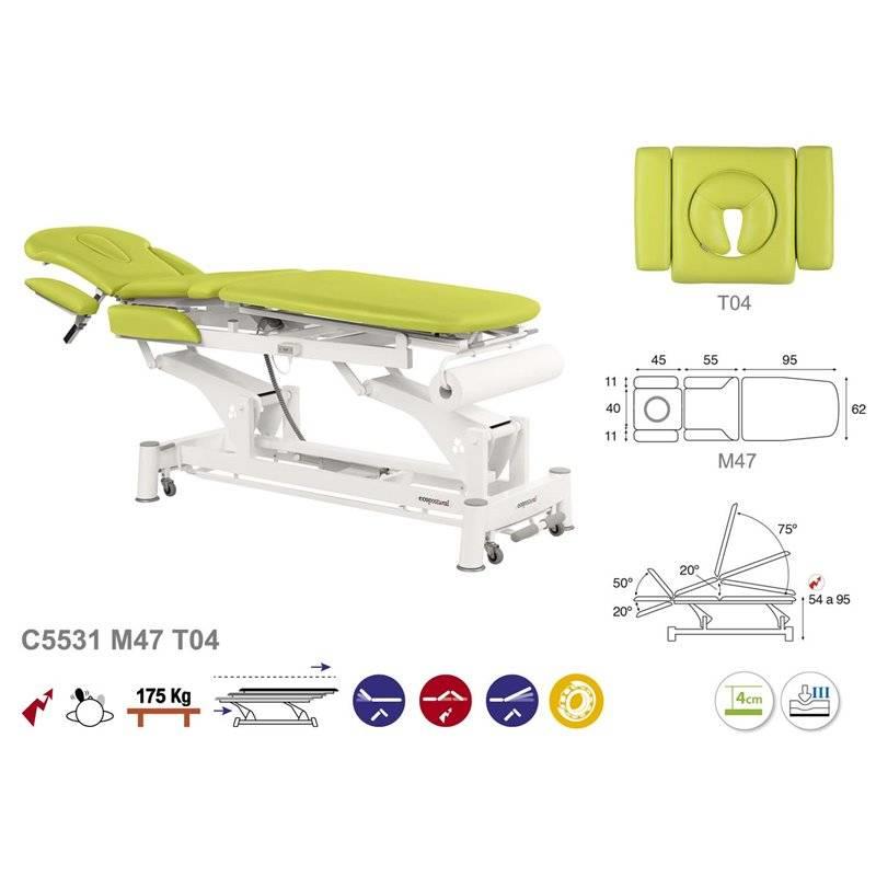 La table repoe sur des articulations à bascule motorisées qui permetter de monter ou descendre le fauteuil afin d'accueillir au mieux le client. La levée ou descente du fauteuil se gère via une commande reliée à la table.