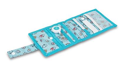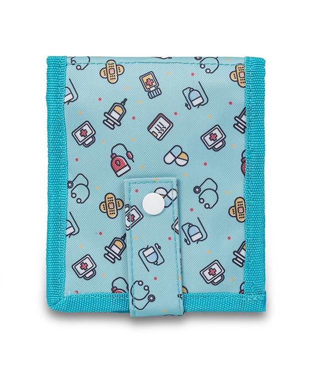 Cette pochette est conçue afin de pouvoir être contenue dans une poche de blouse d'infirmière. La pochette permet de stocker tout le petit nécessaire hospitalier dont les infirmières ont régulièrement besoin. Par exemple, la pochette peut contenir des robinets à trois voies, une torche médicale,...