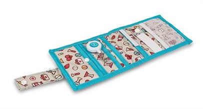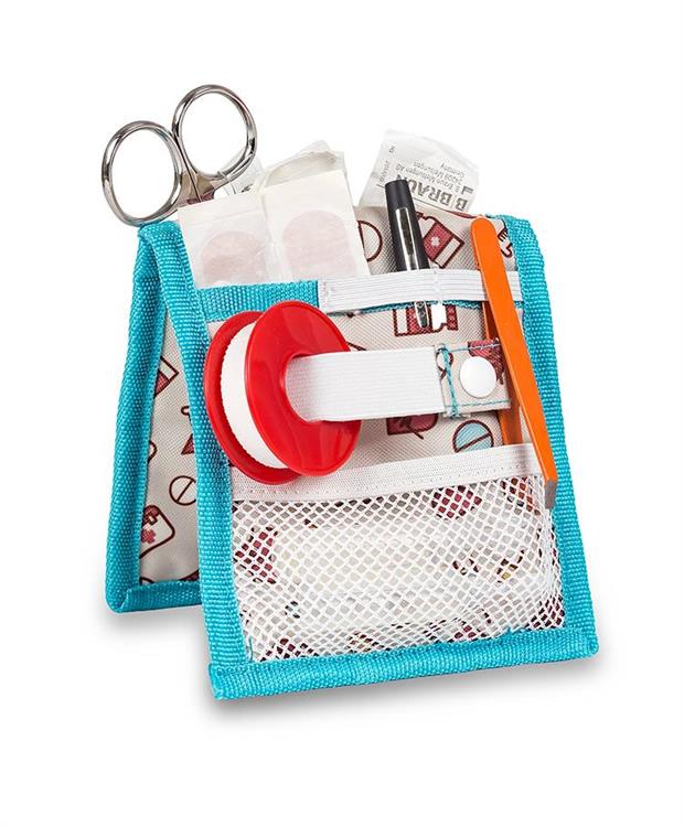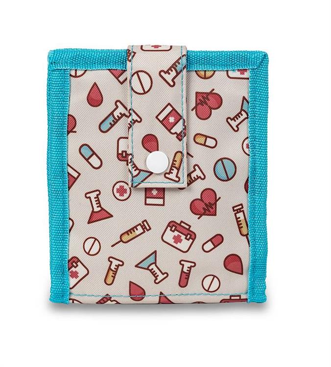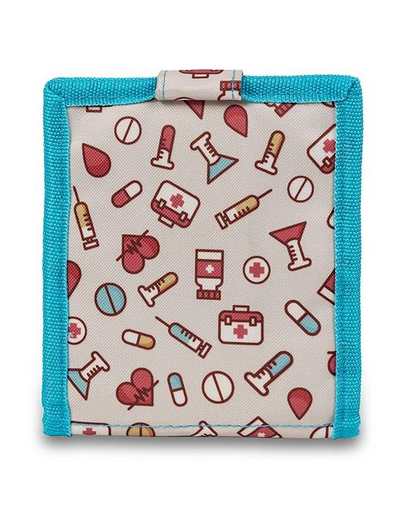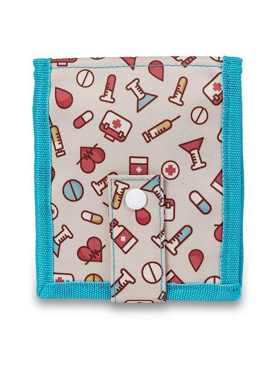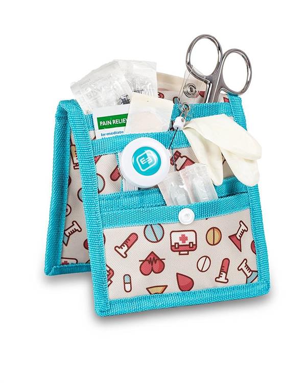 Cette pochette est conçue afin de pouvoir être contenue dans une poche de blouse d'infirmière. La pochette permet de stocker tout le petit nécessaire hospitalier dont les infirmières ont régulièrement besoin. Par exemple, la pochette peut contenir des robinets à trois voies, une torche médicale,...
