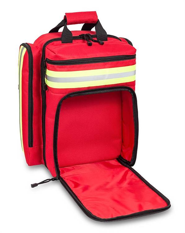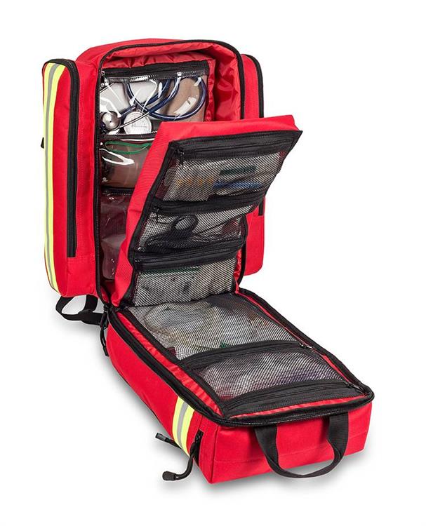 Son compartiment principal a un rabat qui divise le corps principal en deux compartiments séparés de grande capacité avec des poches en filet ou en PVC qui permettent à l'utilisateur de stocker tout le matériel et les équipements médicaux nécessaires. Son système d'ouverture permet d'ouvrir complètement le sac afin que l'utilisateur puisse facilement accéder à son contenu en cas d'urgence.