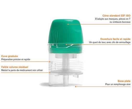 Les appareils générateurs d’aérosol et le kit de nébulisation (nébuliseur + interface de délivrance) forment un couple compatible ayant prouvé son efficacité sur le plan de la granulométrie des particules diffusées. Bien respecter les notices respectives.
