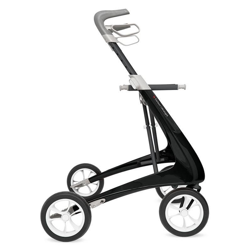 Le Carbon Ultralight est très léger, il ne pèse que 4,8 kg. Cela le rend très souple à l’usage et très pratique pour le rangement et pour le transport en voiture, bus ou train. Il est conçu en fibres de carbone ce qui permet de combiner légèreté avec solidité. Les poignées tournées vers l’avant offrent plus d’ergonomie à l’utilisateur et une position bien droite dans son déambulateur. Le caoutchouc doux des pneus permet d’absorber les chocs