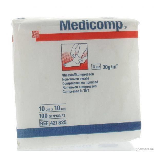 La compresse Medicomp est une pièce de gaze, repliée plusieurs fois sur elle-même, en carré. Elle s'utilise en complément ou en association de bande, désinfectant, pansement. Cette compresse trouvera idéalement sa place dans une trousse de secours.