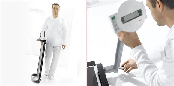 L’unité d’affichage pivotante à grands chiffres LCD permet une lecture du poids aussi commode pour le patient que pour le personnel. La plateforme de pesée seca 665 se replie en un clin d’oeil et est mobile grâce à ses roulettes de transport.