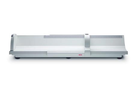 La surface d’appui particulièrement large, et les bords latéraux relevés et arrondis assurent le positionnement sûr et correct du bébé. L’appuie-pieds fixé sur des roulettes coulisse dans deux glissières et le long de l’échelle graduée ; il peut être bloqué en position de mesure de sorte qu’on peut s’occuper d’abord du bébé avant de noter le résultat de la mesure.