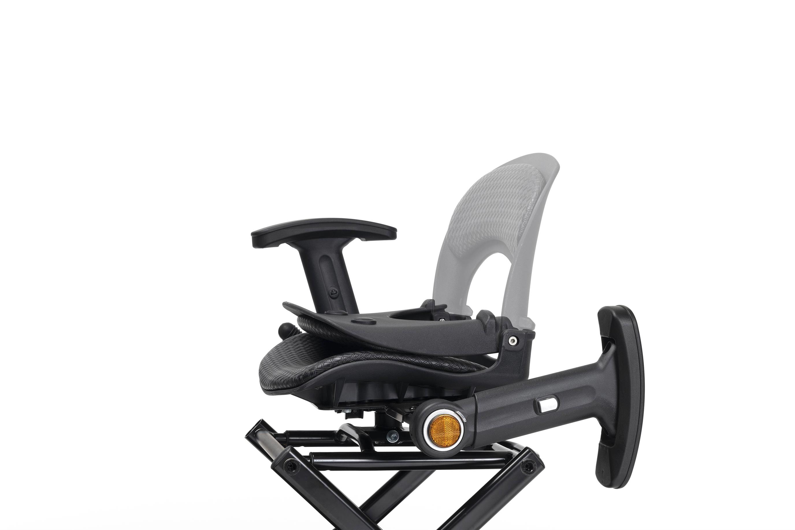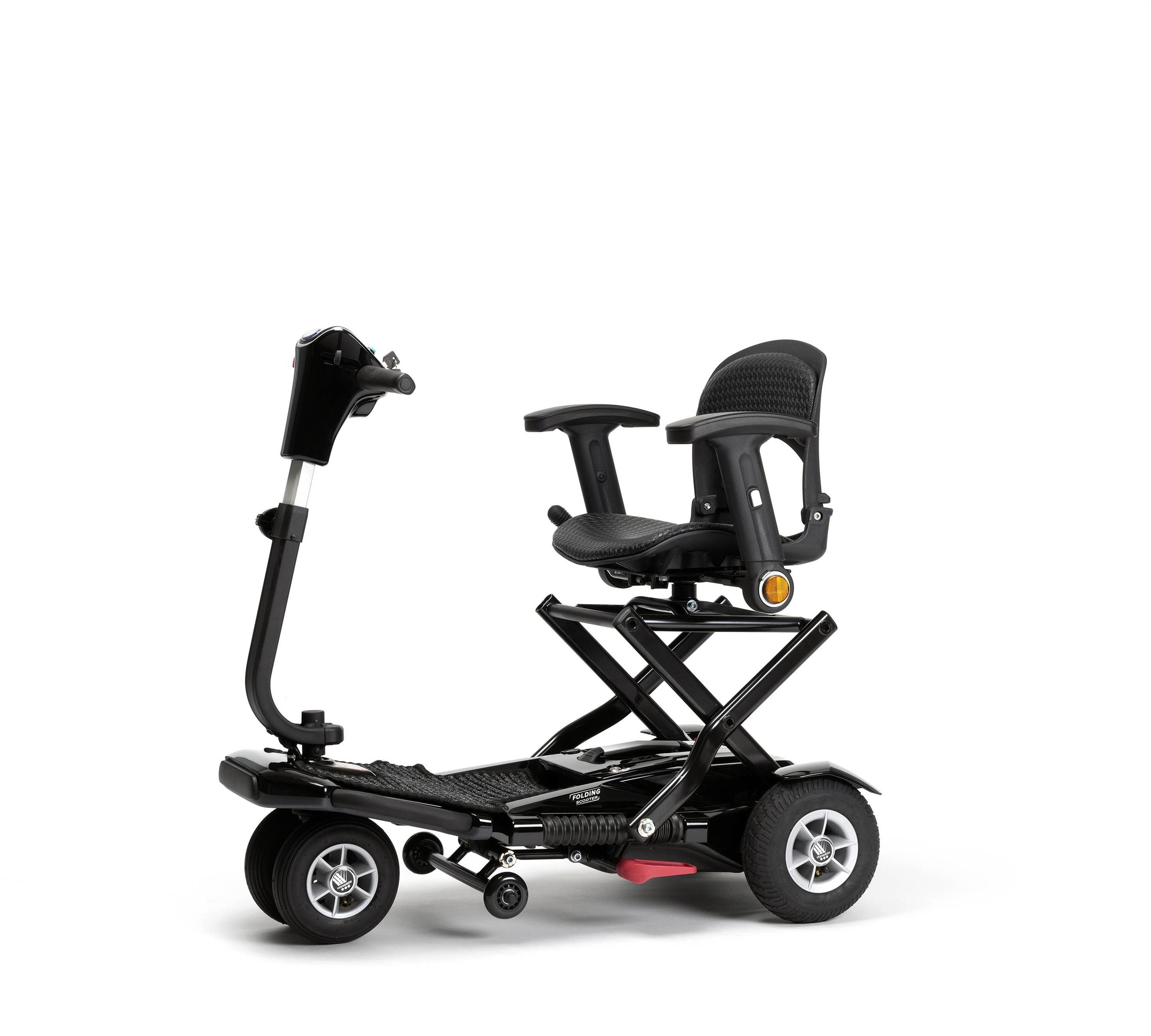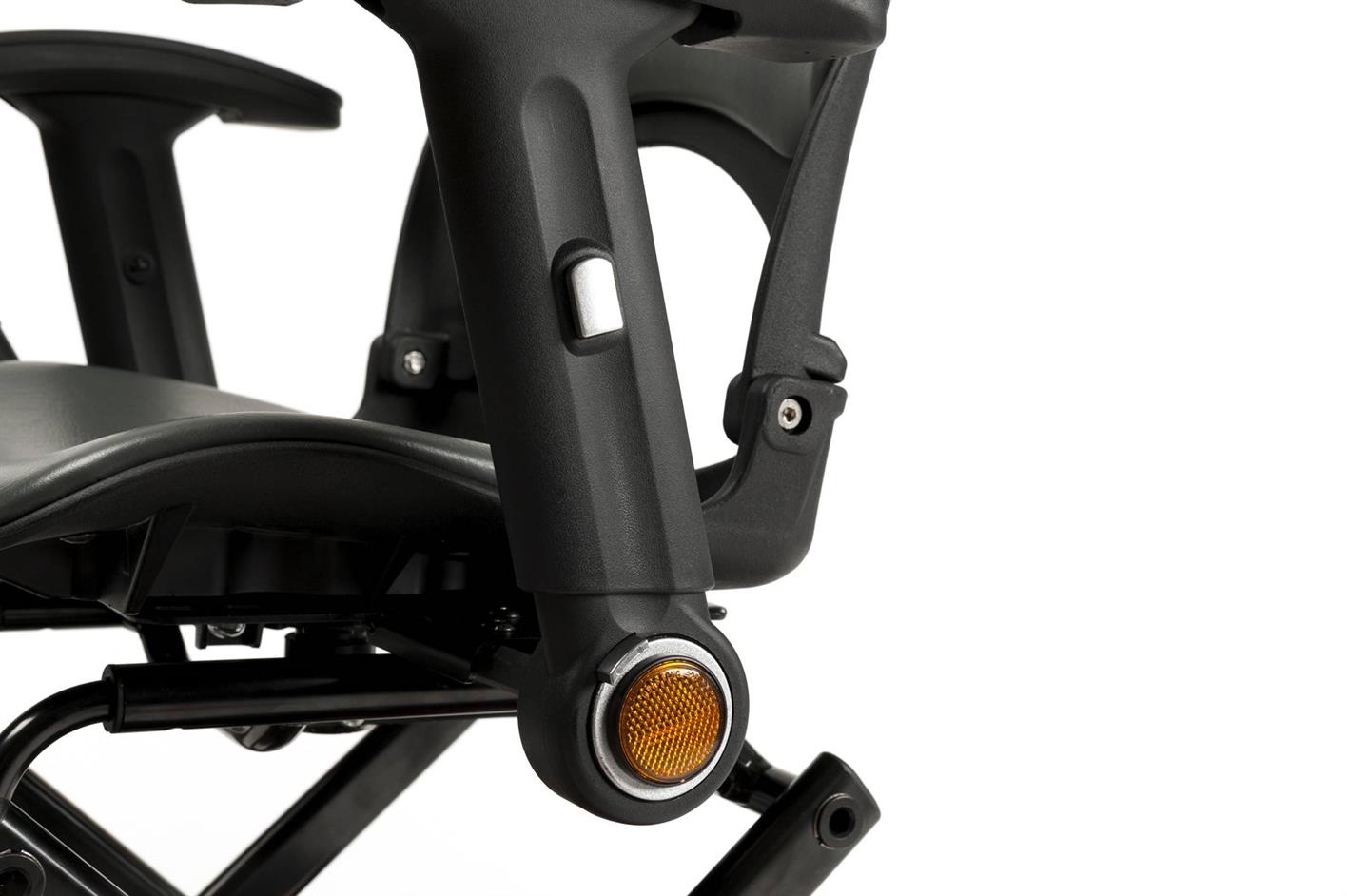 Également équipé d’un siège pivotant avec accoudoirs rabattables et réglables avec réflecteurs latéraux, une batterie au lithium amovible avec verrouillage antivol et des pneus pneumatiques.