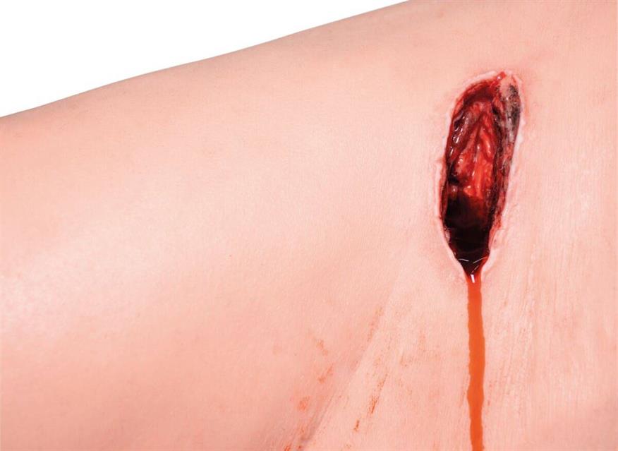 Un système manuel de pompe à sang fournit du sang artificiel à chaque plaie individuellement, à deux d'entre elles ou à trois plaies en même temps. Divers scénarios d'hémorragie pulsatile veineuse ou artérielle peuvent être simulés facilement et de manière réaliste. L'étudiant obtient un retour d'information direct (arrêt du saignement par occlusion mécanique) lorsque l'application de la technique de contrôle des hémorragies choisie est réussie.