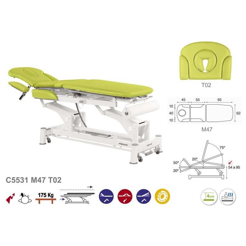 La table repoe sur des articulations à bascule motorisées qui permetter de monter ou descendre le fauteuil afin d'accueillir au mieux le client. La levée ou descente du fauteuil se gère via une commande reliée à la table.