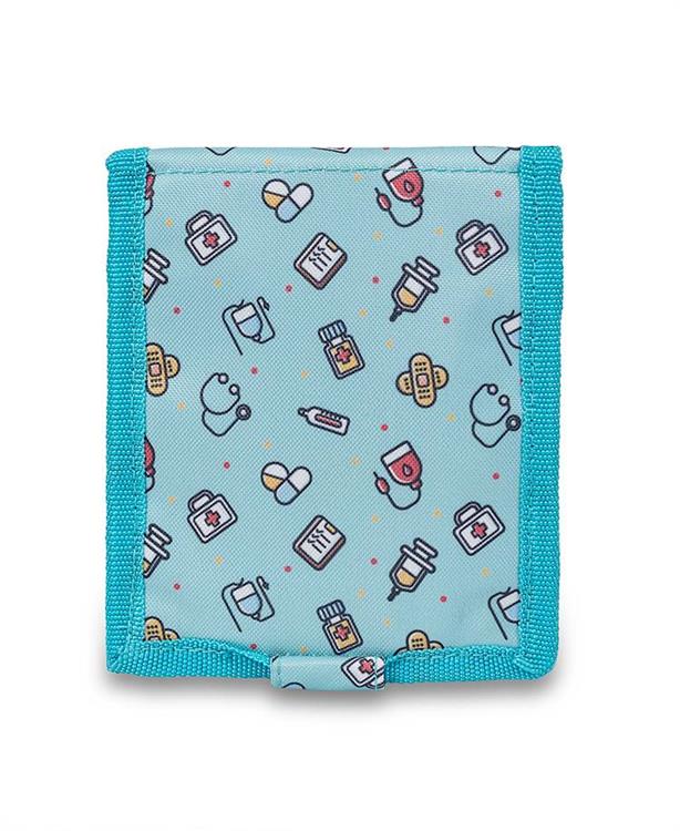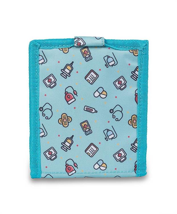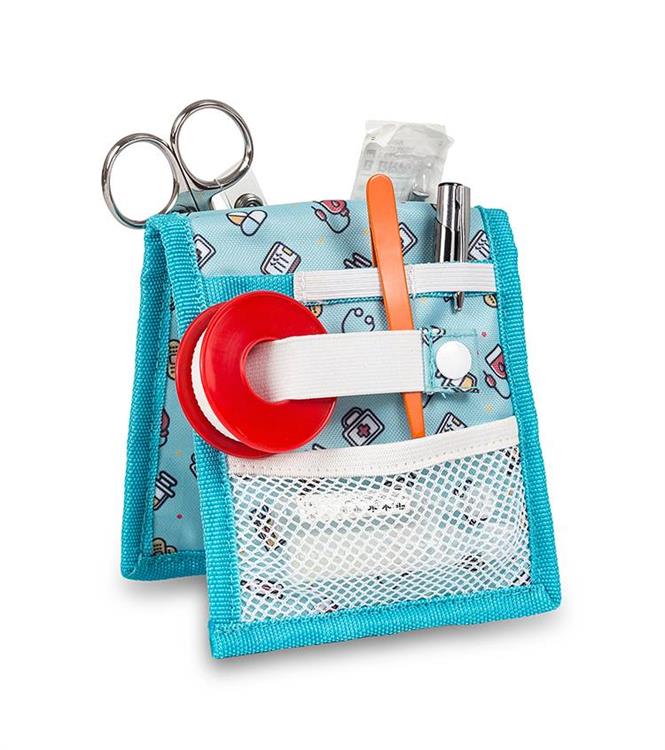 Cette pochette est conçue afin de pouvoir être contenue dans une poche de blouse d'infirmière. La pochette permet de stocker tout le petit nécessaire hospitalier dont les infirmières ont régulièrement besoin. Par exemple, la pochette peut contenir des robinets à trois voies, une torche médicale,...