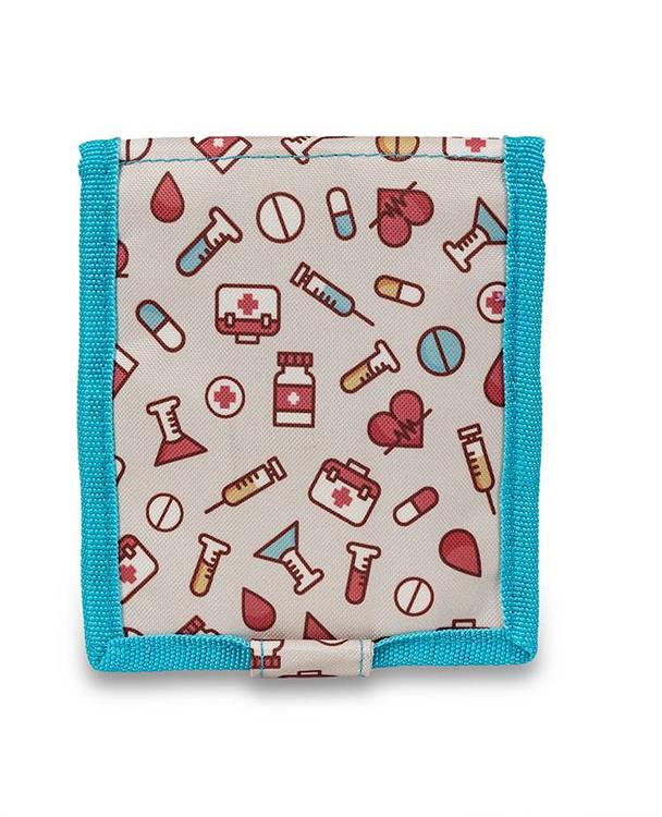 Cette pochette est conçue afin de pouvoir être contenue dans une poche de blouse d'infirmière. La pochette permet de stocker tout le petit nécessaire hospitalier dont les infirmières ont régulièrement besoin. Par exemple, la pochette peut contenir des robinets à trois voies, une torche médicale,...