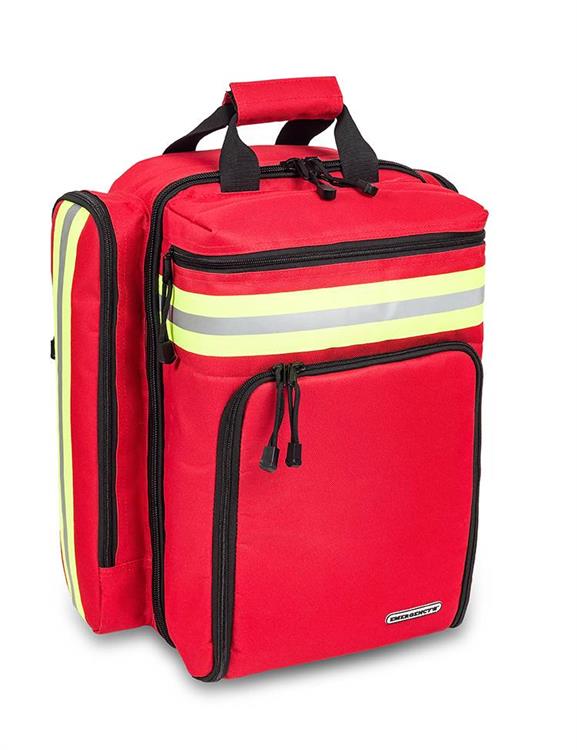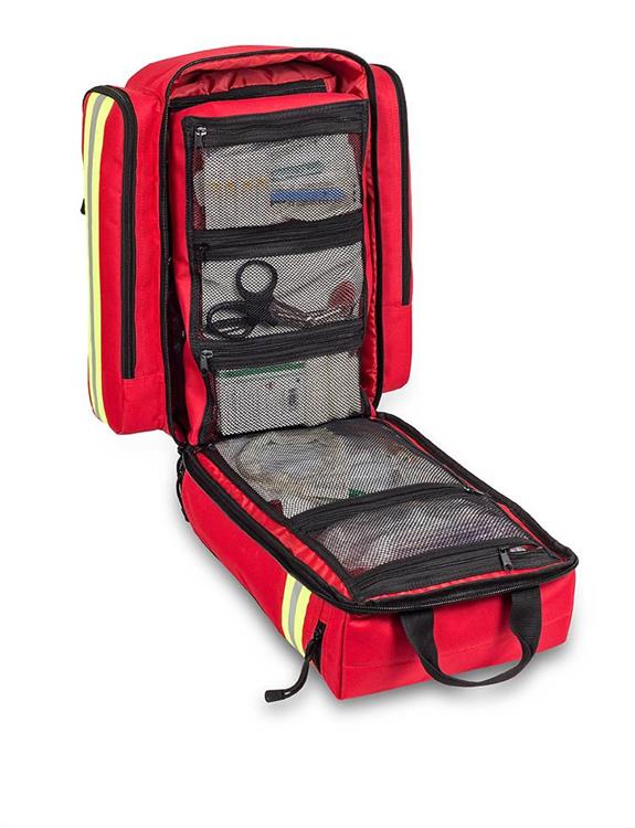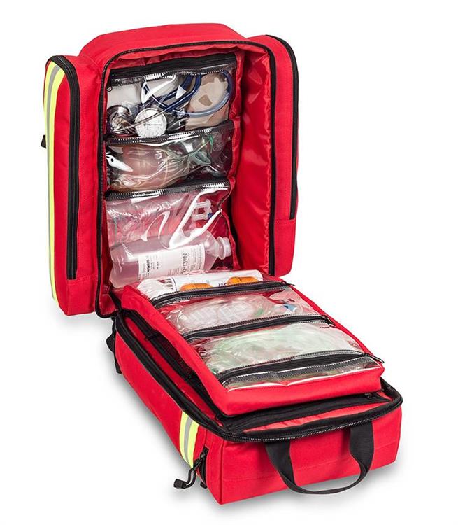 Son compartiment principal a un rabat qui divise le corps principal en deux compartiments séparés de grande capacité avec des poches en filet ou en PVC qui permettent à l'utilisateur de stocker tout le matériel et les équipements médicaux nécessaires. Son système d'ouverture permet d'ouvrir complètement le sac afin que l'utilisateur puisse facilement accéder à son contenu en cas d'urgence.