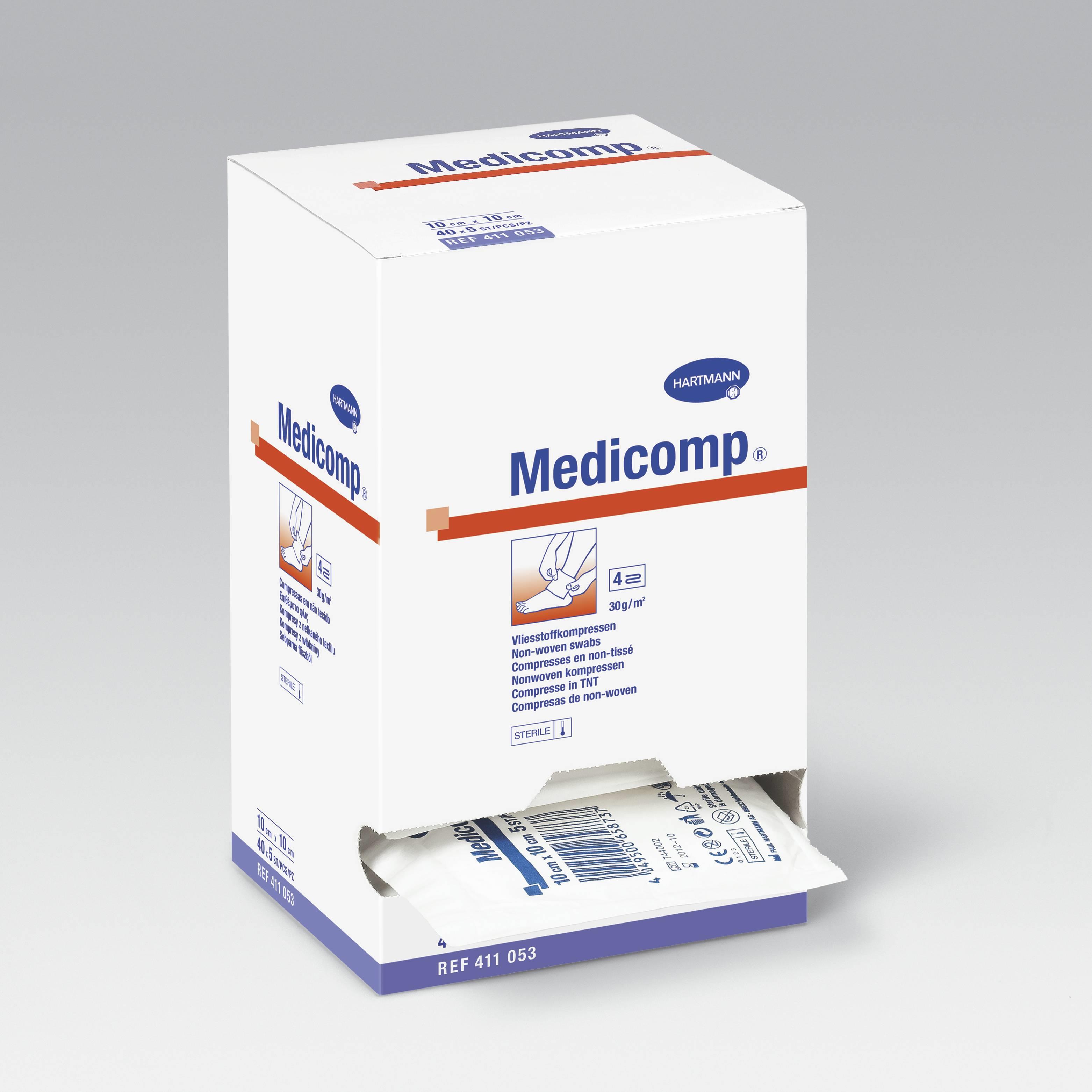 La compresse Medicomp est une pièce de gaze, repliée plusieurs fois sur elle-même, en carré. Elle s'utilise en complément ou en association de bande, désinfectant, pansement. Cette compresse trouvera idéalement sa place dans une trousse de secours.