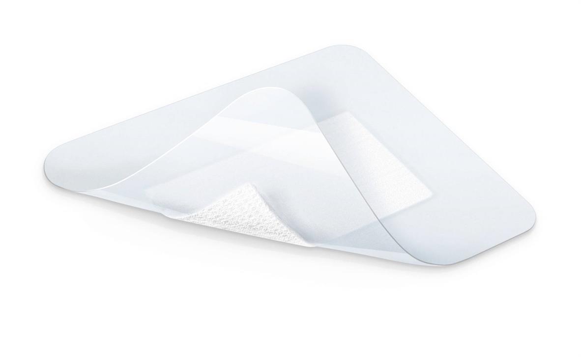 Pansement de plaie autoadhésif, avec coussin de plaie central très absorbant, qui n'adhère pas à la plaie, en film de polyuréthane semi-perméable, imperméable aux germes et à l'eau, transparent, qui permet l'observation des environs de la plaie ainsi que l'absorption des sécrétions dans le coussin absorbant. Adhésif hypoallergénique, s'enlève sans irriter la plaie.