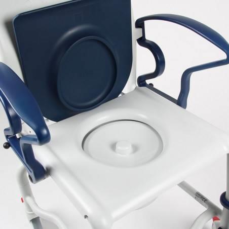 Chaise percée Bonn avec nouveau design et grande flexibilité. Les accoudoirs relevables et les repose-pieds réglables garantissent une entrée et une sortie aisées de la chaise.