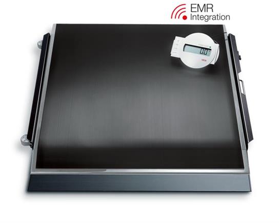 Des roulettes de transport et une poignée assurent la mobilité de la balance seca 675. Avec les solutions d’intégration seca, les valeurs mesurées peuvent être envoyées vers un système DME (Dossier Médical Electronique).