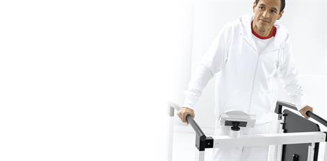 Cette balance permet une pesée sûre en position debout ou assise, ou en fauteuil roulant, sans nécessiter aucune transformation : le patient peut se tenir à une solide main courante ou s’asseoir sur un strapontin intégré.