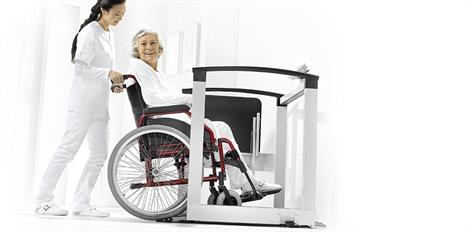 Elle permet également d'accéder à la grande plateforme (76 x 82 cm) en fauteuil roulant dont le poids est tout simplement déduit du résultat de la pesée par la fonction pré-TARE ; une attention toute particulière a été accordée à la bonne accessibilité de la plateforme et à la sûreté de la pesée en fauteuil roulant dont les roues avant sont retenues par une barrière.