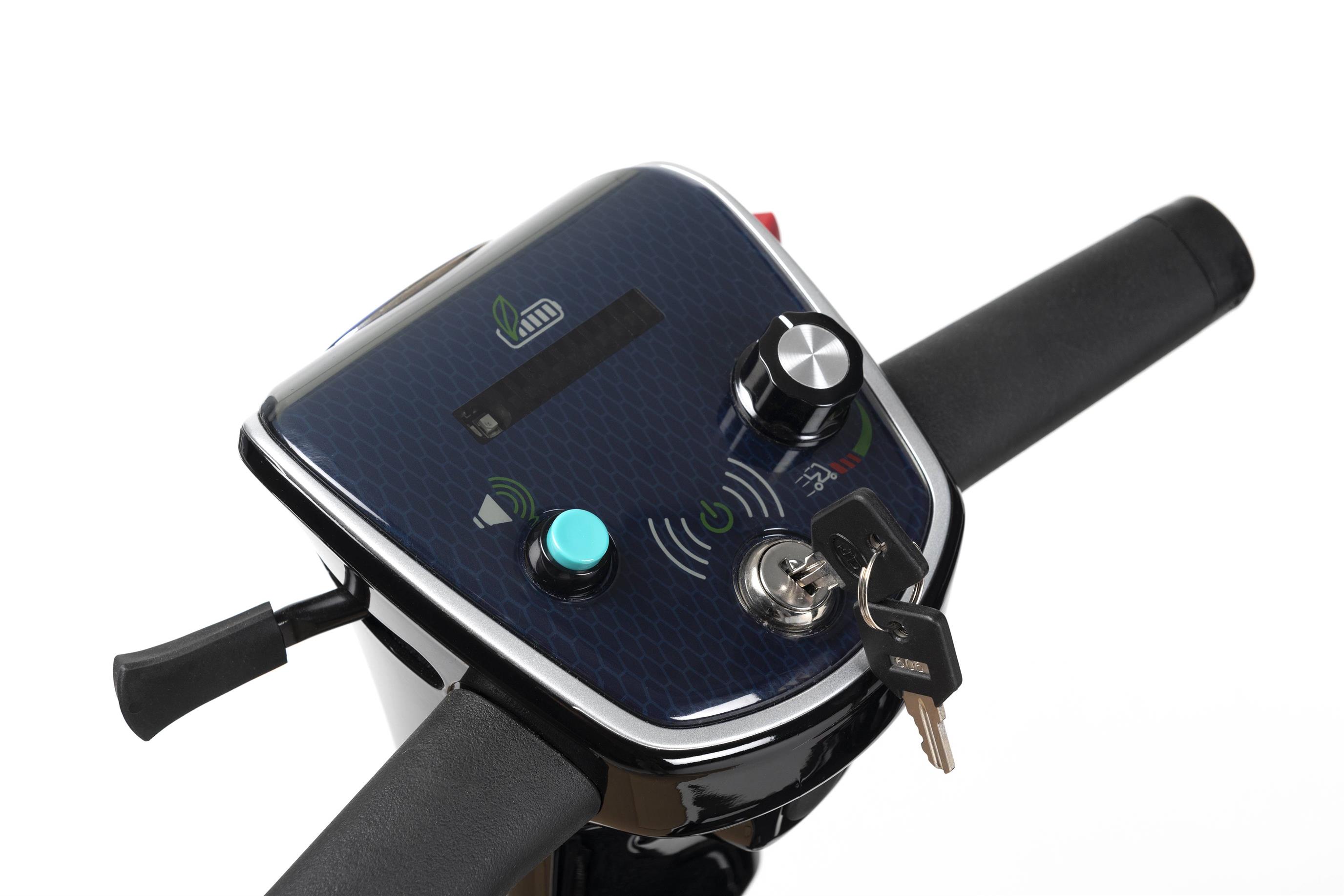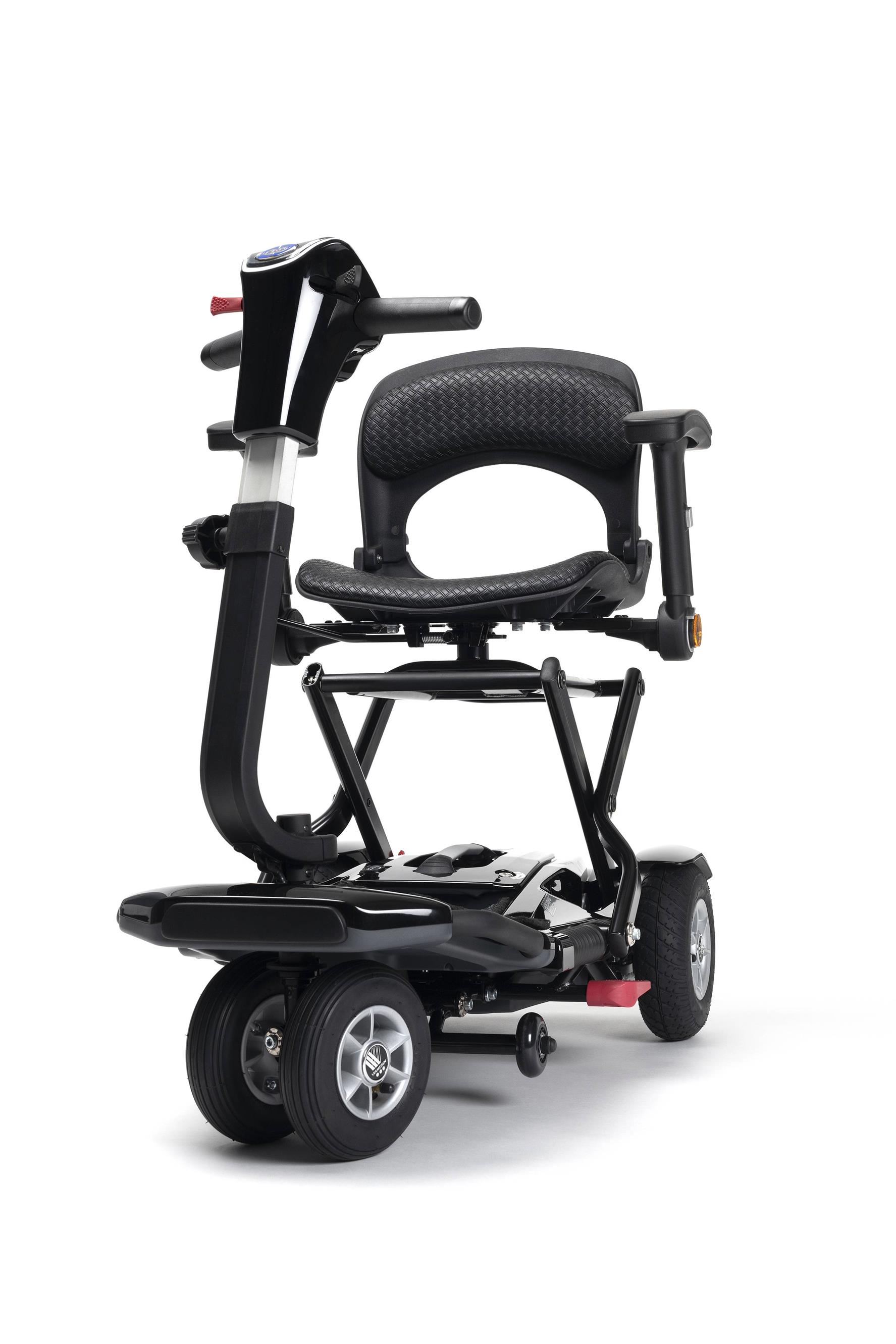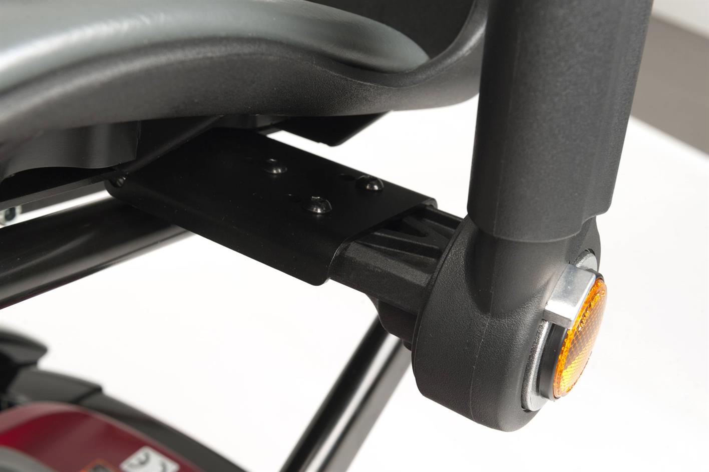 Également équipé d’un siège pivotant avec accoudoirs rabattables et réglables avec réflecteurs latéraux, une batterie au lithium amovible avec verrouillage antivol et des pneus pneumatiques.